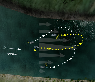 При следовании по течению поворот на обратный курс следует производить «из быстрого течения» в сторону «тихого течения». В этом случае большее течение более эффективно забрасывает корму в сторону противоположную повороту.