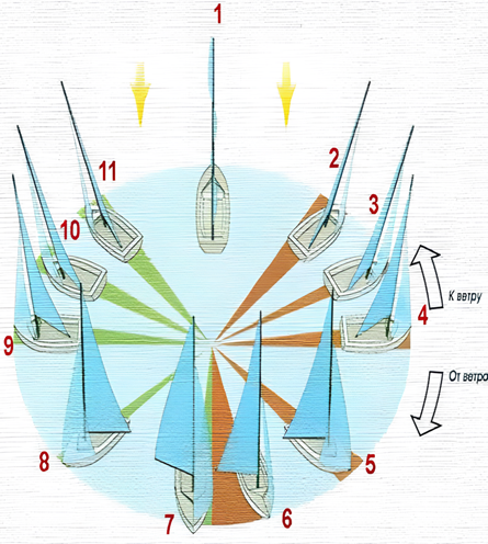 Так как ветер дует в левый борт, то судно идёт левым галсом. Бакштаг — курс, образующий с направлением ветра угол больше 8, но меньше 16 румбов, то есть ветер по отношению к кораблю дует сзади-сбоку. Полный бакштаг — угол составляет не более 20 градусов, то есть приближающийся к фордевинду. Парус устанавливается под углом к ветру с подветренного борта.