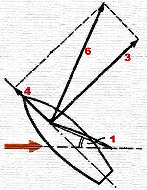 Сила, обозначенная на рисунке цифрой «6», которая направлена перпендикулярно воздушному потоку, называется в аэродинамике подъемной силой. Именно она на острых курсах создает тягу в направлении движения яхты.