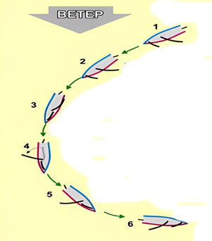 При повороте через фордевинд парусное судно пересекает линию ветра кормой.