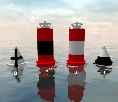 Какой из изображенных на иллюстрации плавучих навигационных знаков выставляется непосредственно над оконечностью препятствия (опасности) со стороны судового хода на левой кромке? | ВВП
