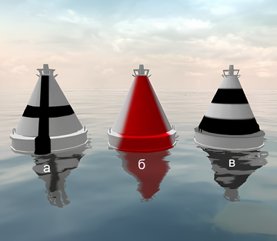 Какой из изображенных на иллюстрации плавучих навигационных знаков называется "Осевой"? | ВВП