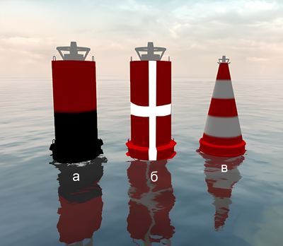 ГОСТ 26600-98 Знаки навигационные внутренних судоходных путей: Кромочный знак служит для обозначения кромок судового хода. У левого берега выставляется белого или чёрного цвета, у правого берега красного цвета.