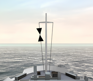 два круговых огня, расположенных по вертикальной линии, верхний из которых должен быть красным, а нижний — белым, или знак, состоящий из двух конусов вершинами вместе, расположенных по вертикальной линии один над другим; судно длиной менее 20 метров вместо этого знака может выставлять корзину.