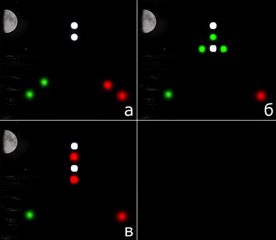 два зелёных круговых огня или два ромба, расположенных по вертикальной линии, — для указания стороны с которой может пройти другое судно;