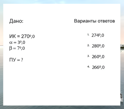 ПУ = ИК +- α +- β = 270,0° + 3,0° + 7,0° = 280,0°.