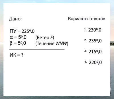 α и β будут иметь знак плюс, так как течение вытекает из компаса, а при путевом угле равным 225°, ветер дует в левый борт судна.