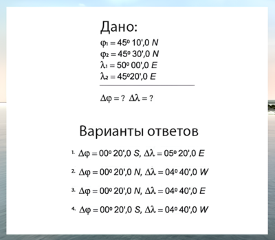 Δϕ = ϕ2 — ϕ1 = 45°30',0 N — 45°10',0 N = 00°20,0 N