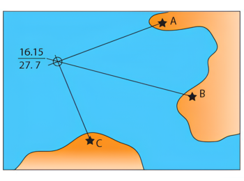 При определении места по трём пеленгам в быстрой последовательности выбирают на карте три удобно расположенных ориентира А, В и С и находят их на местности. берут КП ориентиров в определенной последовательности, записывают их величины, а в момент взятия последнего пеленга замечают отсчет лага и время. исправляют КП в ИП и прокладывают ОИП на карте от соответствующих ориентиров. Если пеленги взяты одновременно, то обсервованное место судна будет в точке пересечения линий ОИП