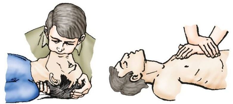 Искусственное дыхание, освобождение дыхательных путей, наружный массаж сердца.