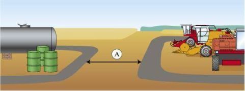 В период проведения массовых полевых работ при хранении самоходных машин на открытых площадках на какое расстояние они должны быть удалены от мест временного хранения топливо-смазочных материалов? |
