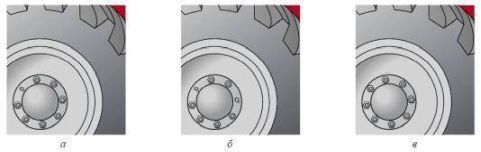 Отсутствие одной гайки крепления колеса и ступицы (а).